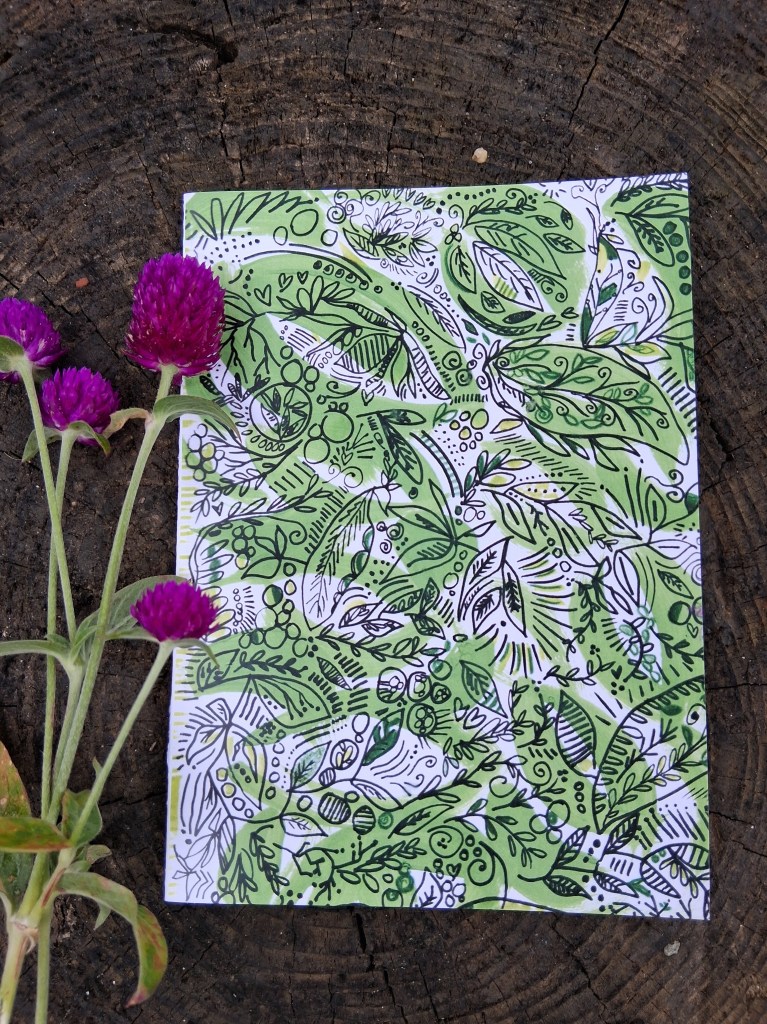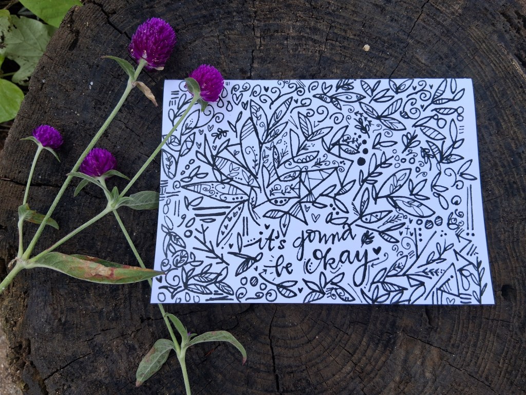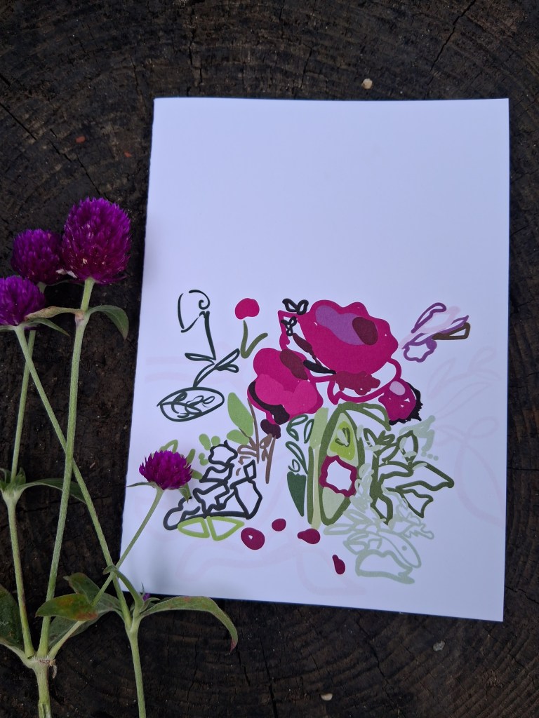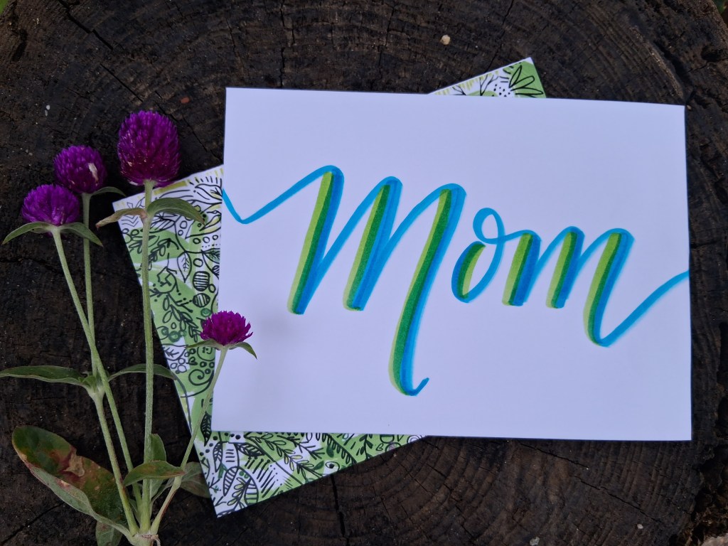 - Each greeting card is 5”x7”, blank inside, with envelope. Features original hand-drawn illustrations. Basic custom lettering of name of recipient can be drawn in large cursive on envelope as pictured for an additional $2 – just let me know when you’re ordering.